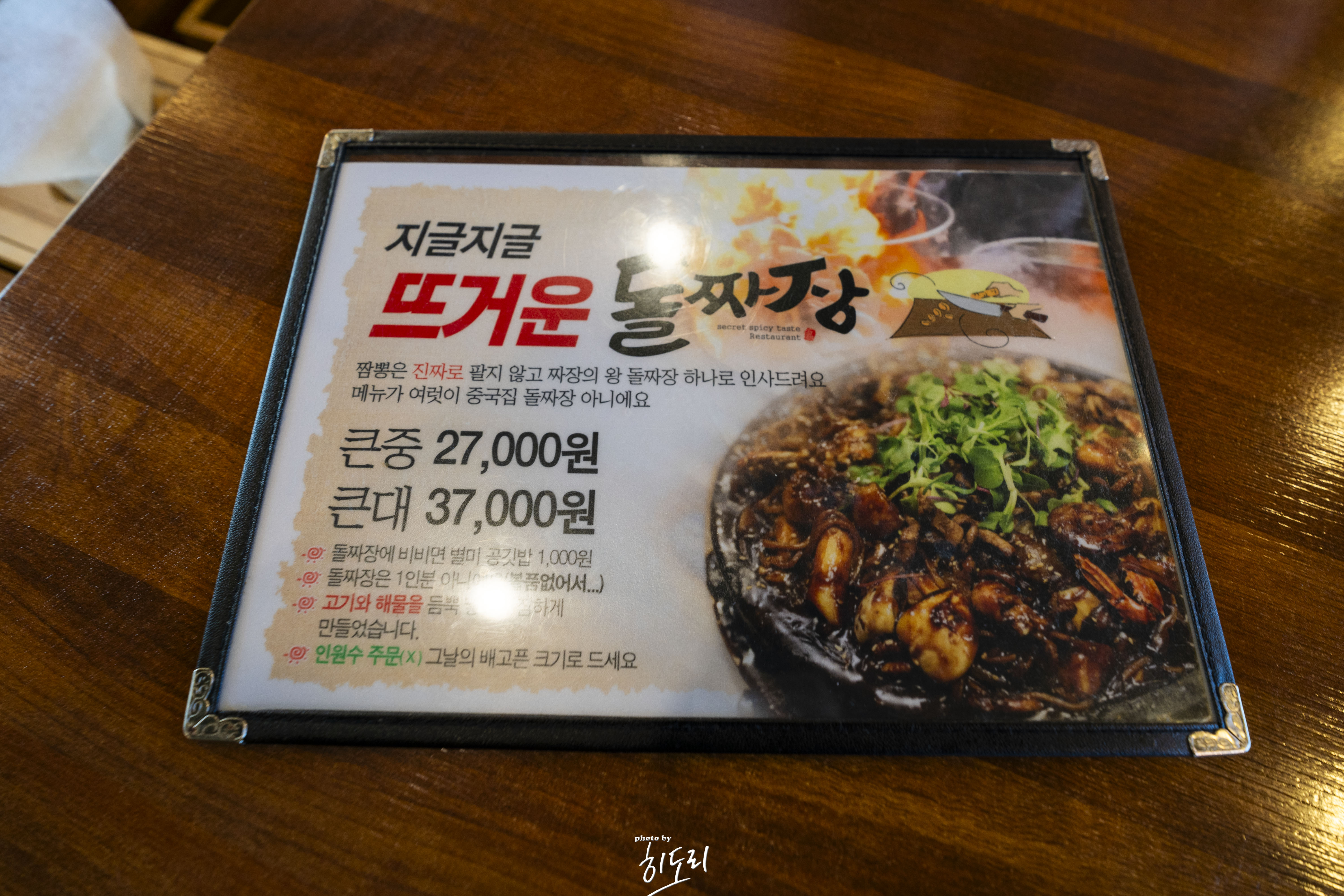 가지산돌짜장의 메뉴는 단출하지만, 그 맛이 일품입니다. 메뉴는 '매운돼지갈비찜'과 '돌짜장' 두 가지로, 각각 38,000원과 27,000원(3인분 기준)입니다.