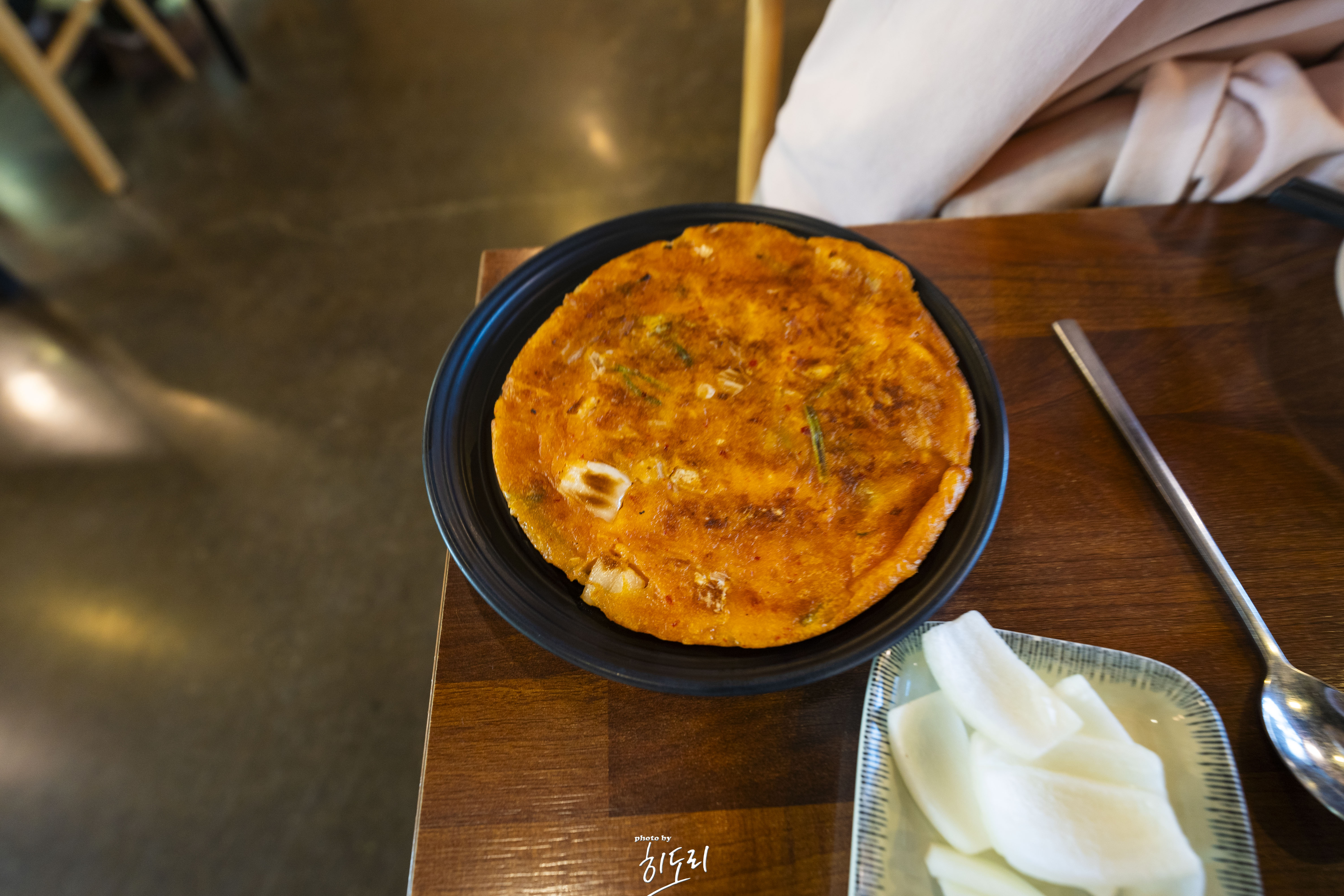 가게 내부는 넓고 쾌적하며, 테이블도 충분히 마련되어 있어 단체 방문에도 적합합니다. 밑반찬은 김치, 단무지, 양파 등으로 깔끔하게 준비되어 있으며, 김치전 한판은 무료로 제공됩니다.