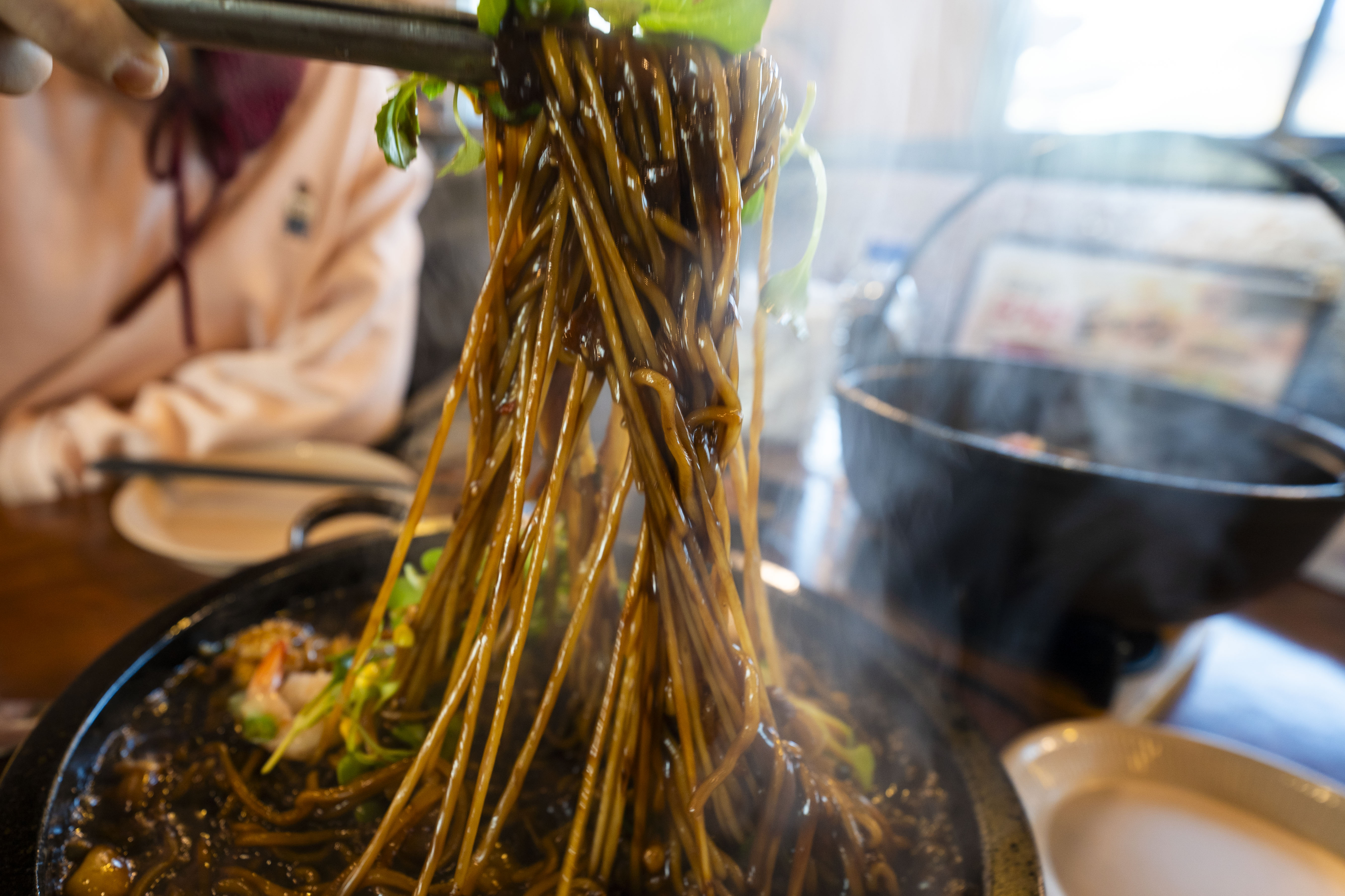 돌짜장은 오징어, 쭈꾸미, 새우 등 푸짐한 해산물이 들어가 있으며, 음식이 식지 않는 돌판에 제공됩니다. 면은 쫄깃쫄깃하고, 짜장 소스의 깊은 맛이 일품이었어요.