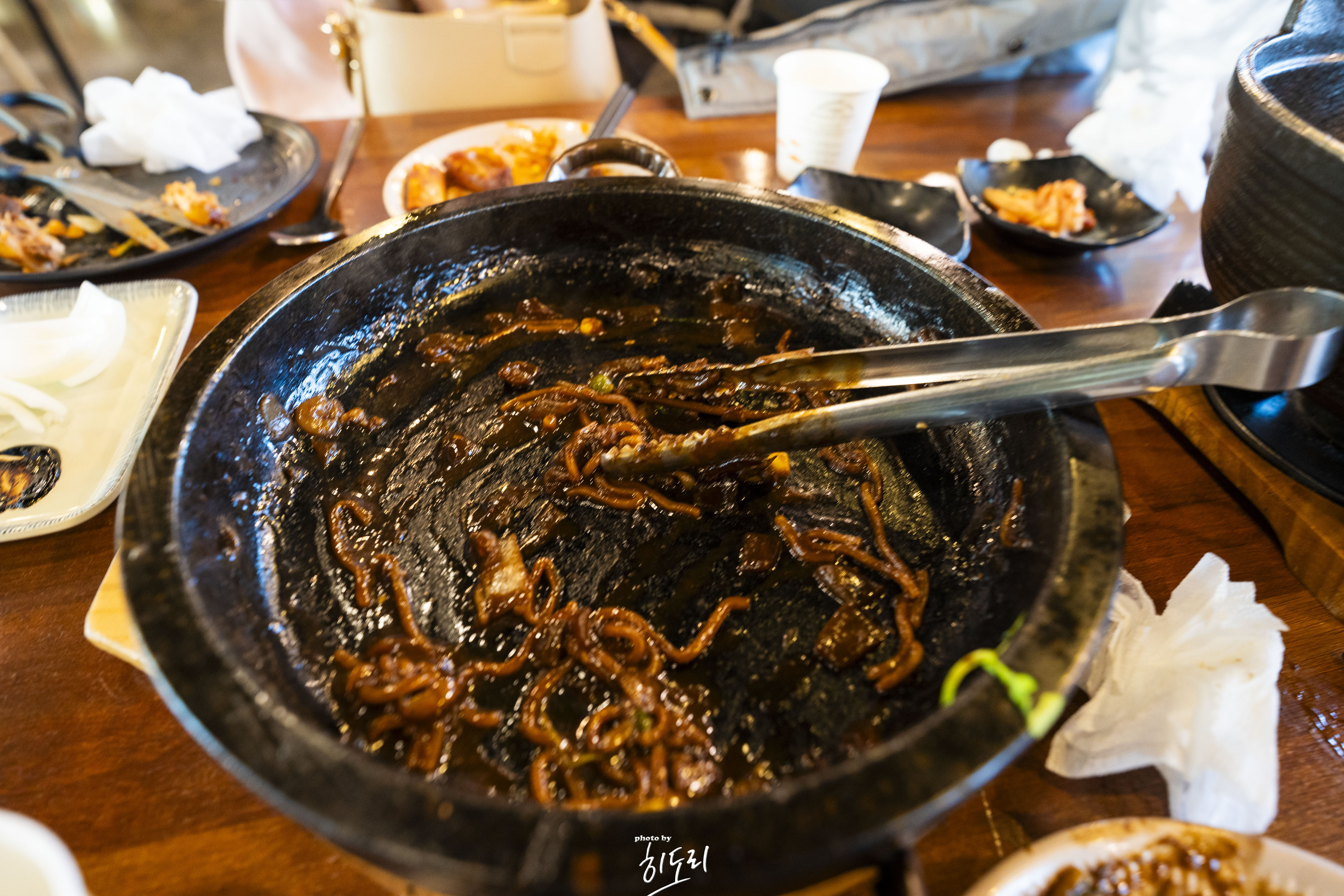 가게 내부는 넓고 쾌적하며, 테이블도 충분히 마련되어 있어 단체 방문에도 적합합니다. 밑반찬은 김치, 단무지, 양파 등으로 깔끔하게 준비되어 있으며, 김치전 한판은 무료로 제공됩니다.