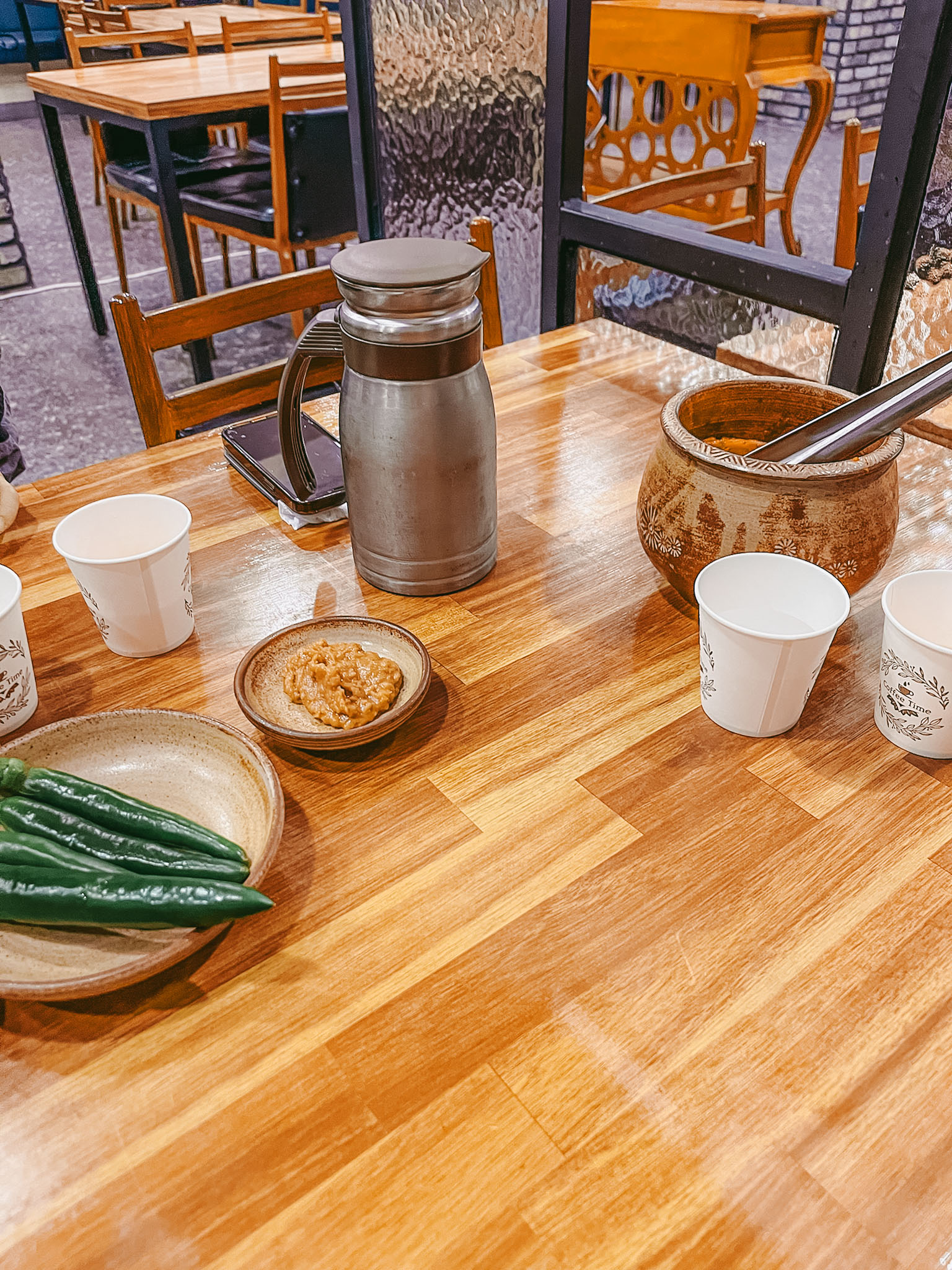 반찬은 김치, 고추, 쌈장인데, 김치는 접시에 덜어먹는 스타일이에요.