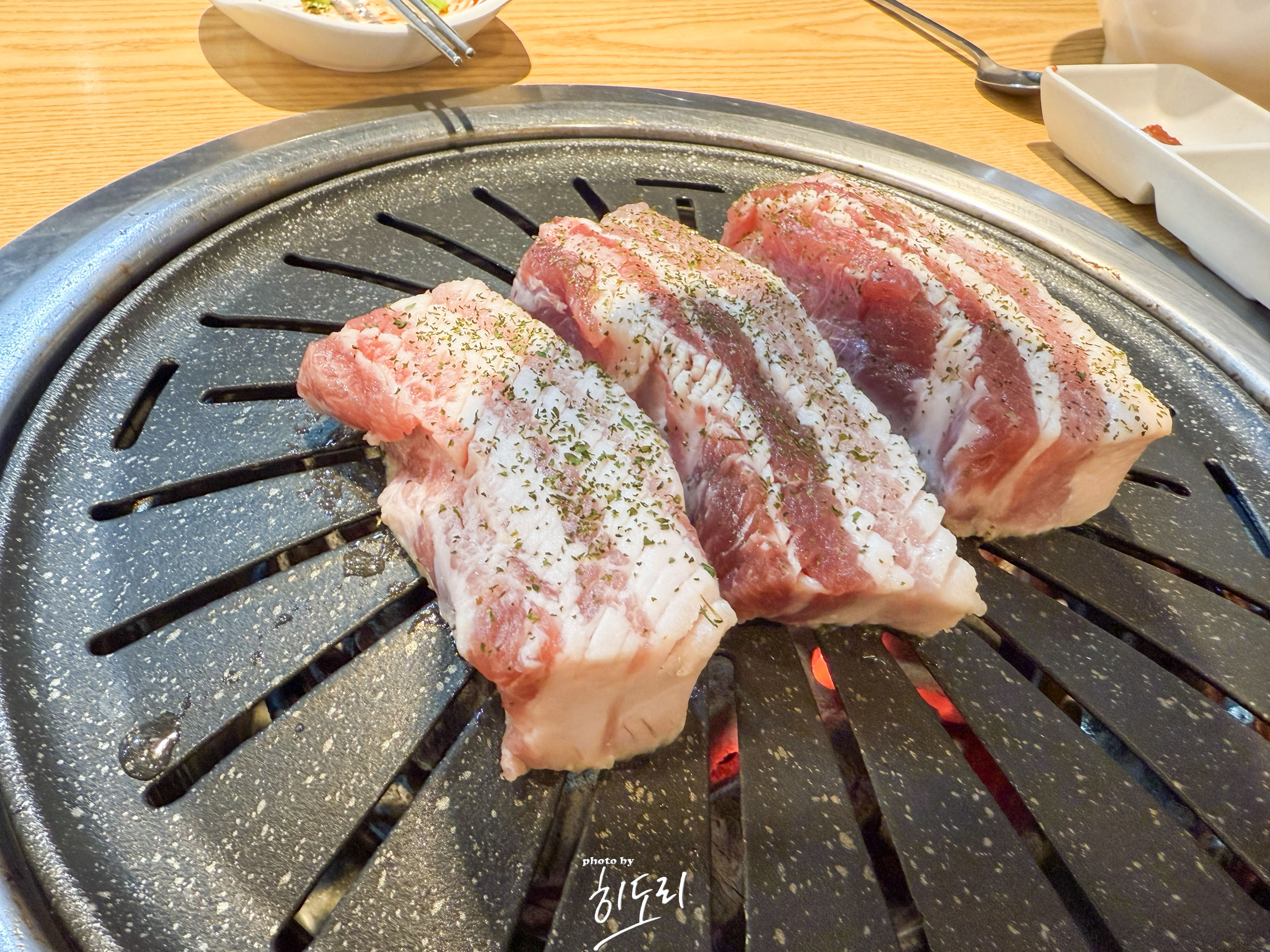 고기를 주문하고 나온 숙성 삼겹살은 두께와 마블링이 완벽했습니다. 숯불 위에서 구워지며 나는 고소한 향은 입맛을 자극하기에 충분했어요.