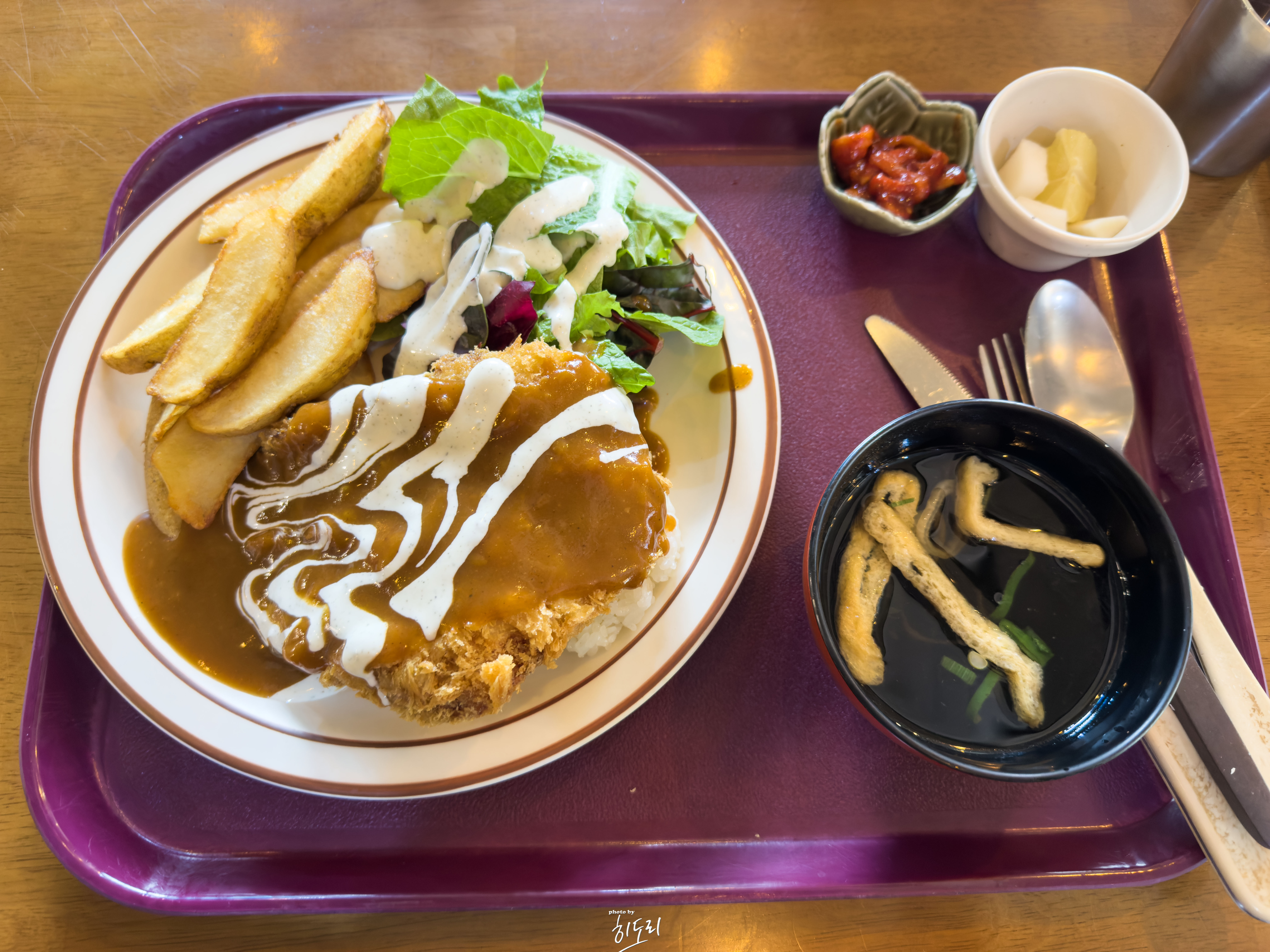 돈까스, 밥, 감자튀김, 샐러드, 우동국물, 무말랭이, 무피클까지 한 접시 꽉 찬 구성!