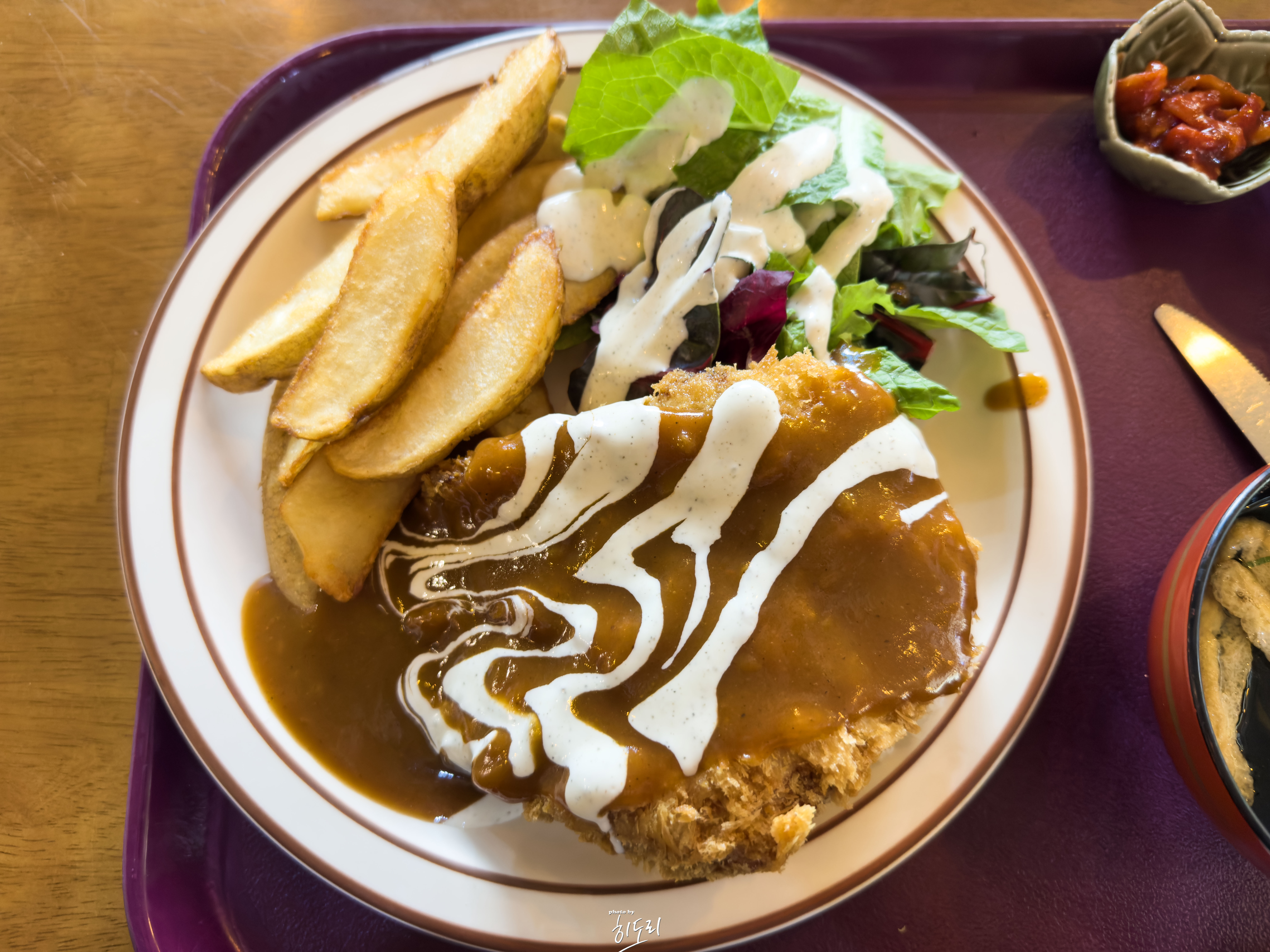 돈까스, 밥, 감자튀김, 샐러드, 우동국물, 무말랭이, 무피클까지 한 접시 꽉 찬 구성!