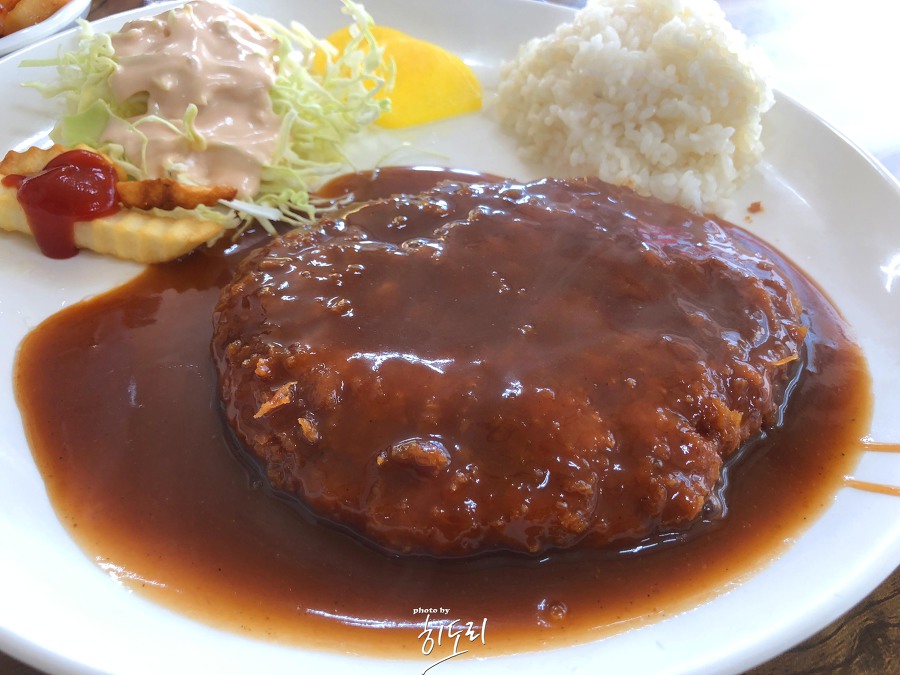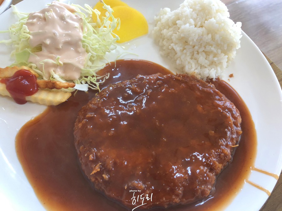 두 번째로 주문한 돈까스는 전날 제주에서 먹은 흑돼지 돈까스와는 다른, 분식점 스타일의 돈까스였습니다. 고기가 두껍고, 튀김옷도 적당히 두꺼워서 만족스러웠습니다. 밥 양이 부족해 추가 주문해서 칼국수와 돈까스를 먹으니 꽤 푸짐한 식사를 마무리할 수 있었습니다.