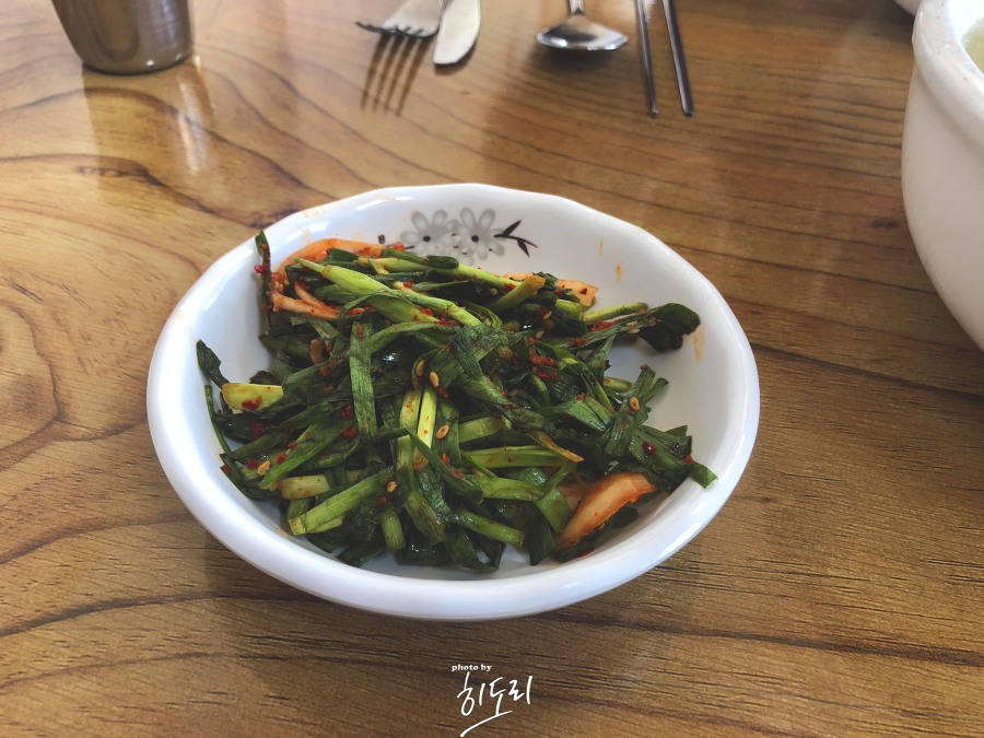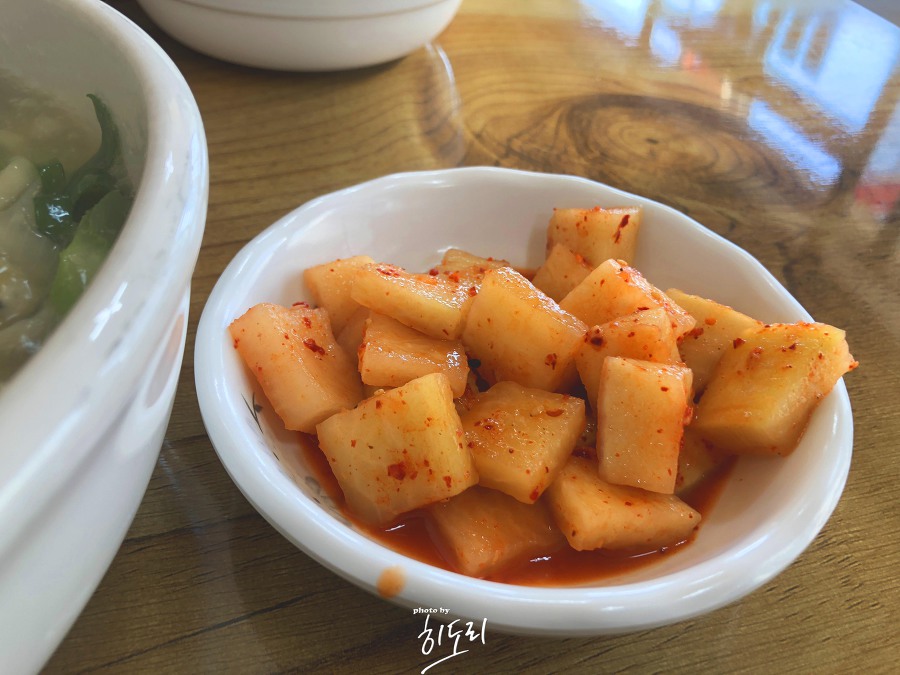 기본 밑반찬으로는 깍두기와 파김치가 제공됩니다. 깍두기는 아삭아삭하고 시큼 달달한 맛이 나서 국밥이 생각나는 맛이었습니다. 파김치도 칼국수와 잘 어울렸어요.