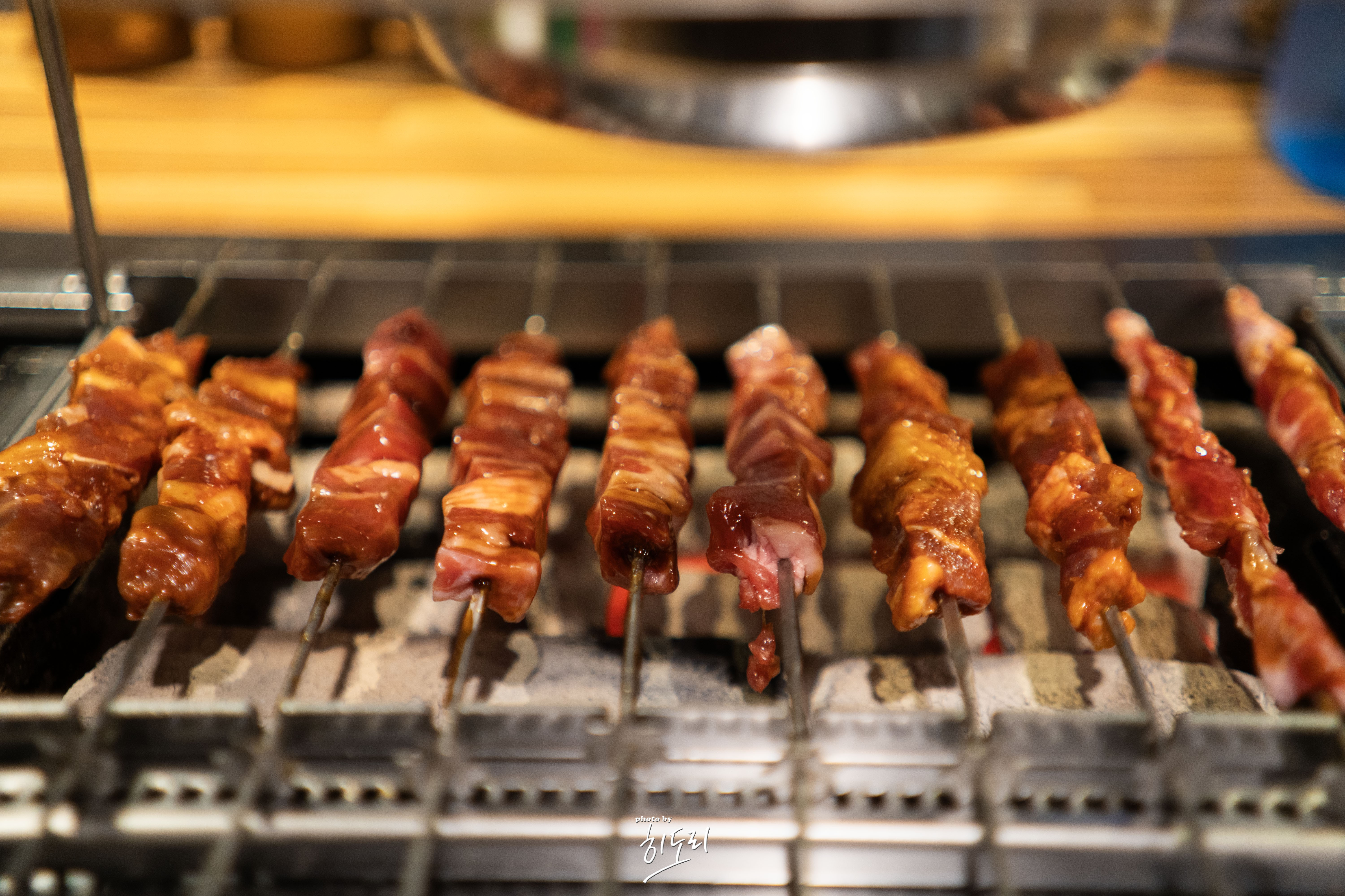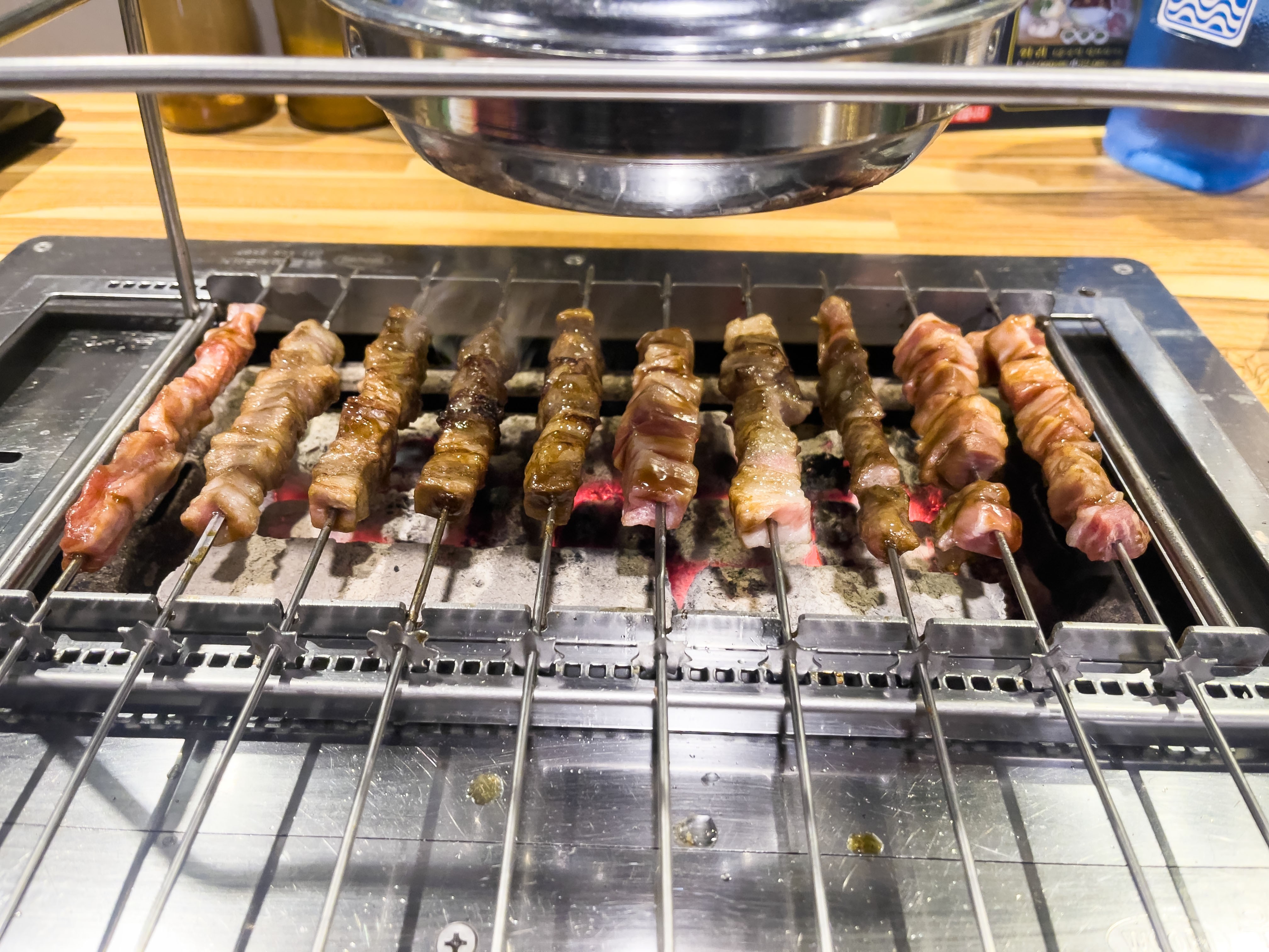 안으로 들어가면 테이블마다 자동 회전 꼬치구이 장비가 설치되어 있어서,