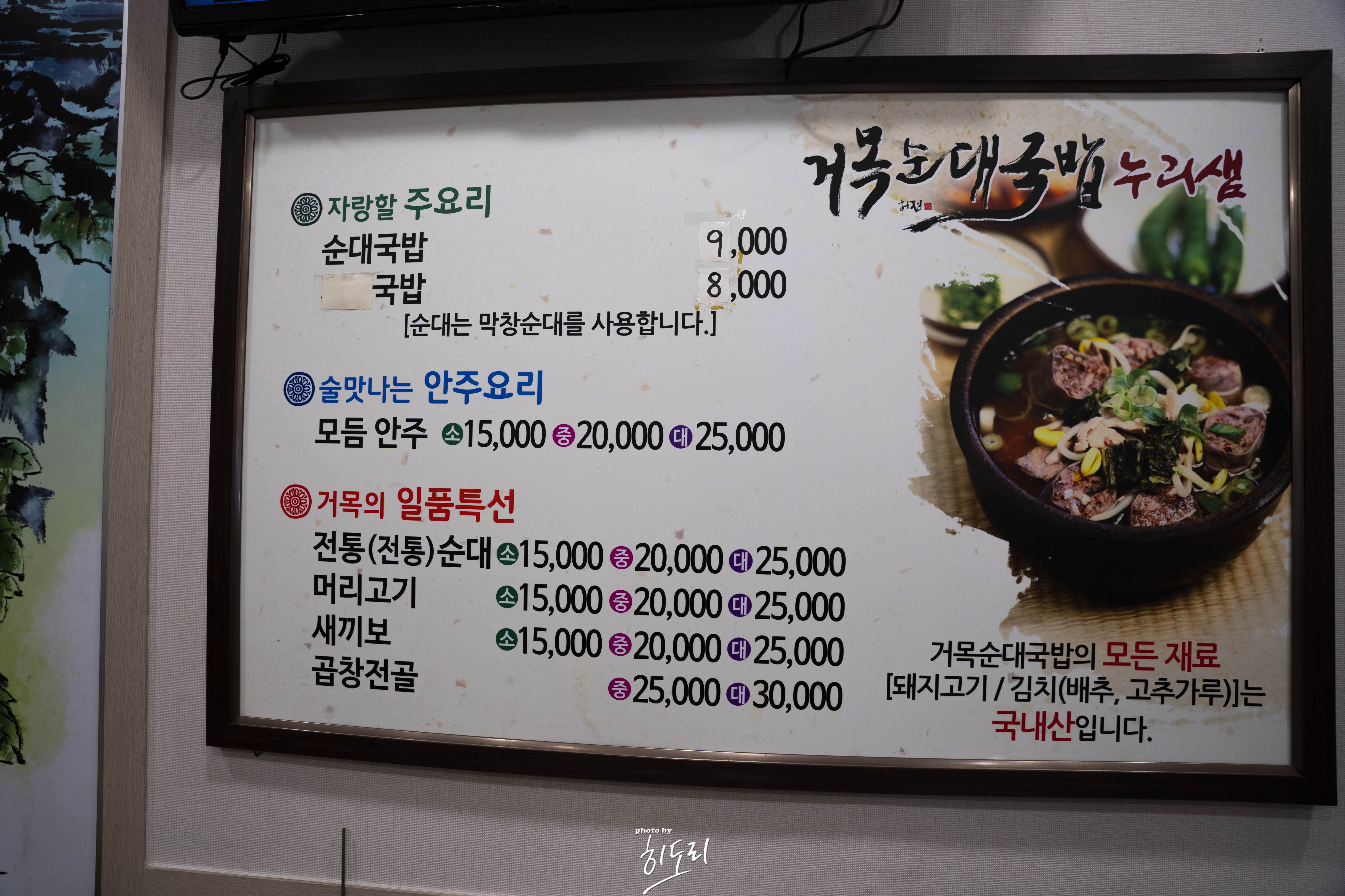 메뉴판을 보면 순대국밥이 9,000원, 일반 국밥이 8,000원이에요. 요즘 국밥 가격을 생각하면 고급 음식점 못지않은 가격이지만, 맛과 퀄리티를 생각하면 전혀 아깝지 않아요. 저는 국밥 2그릇과 머리고기 小를 주문했는데요, 순대와 머리고기의 환상적인 조합! 정말 추천해요.