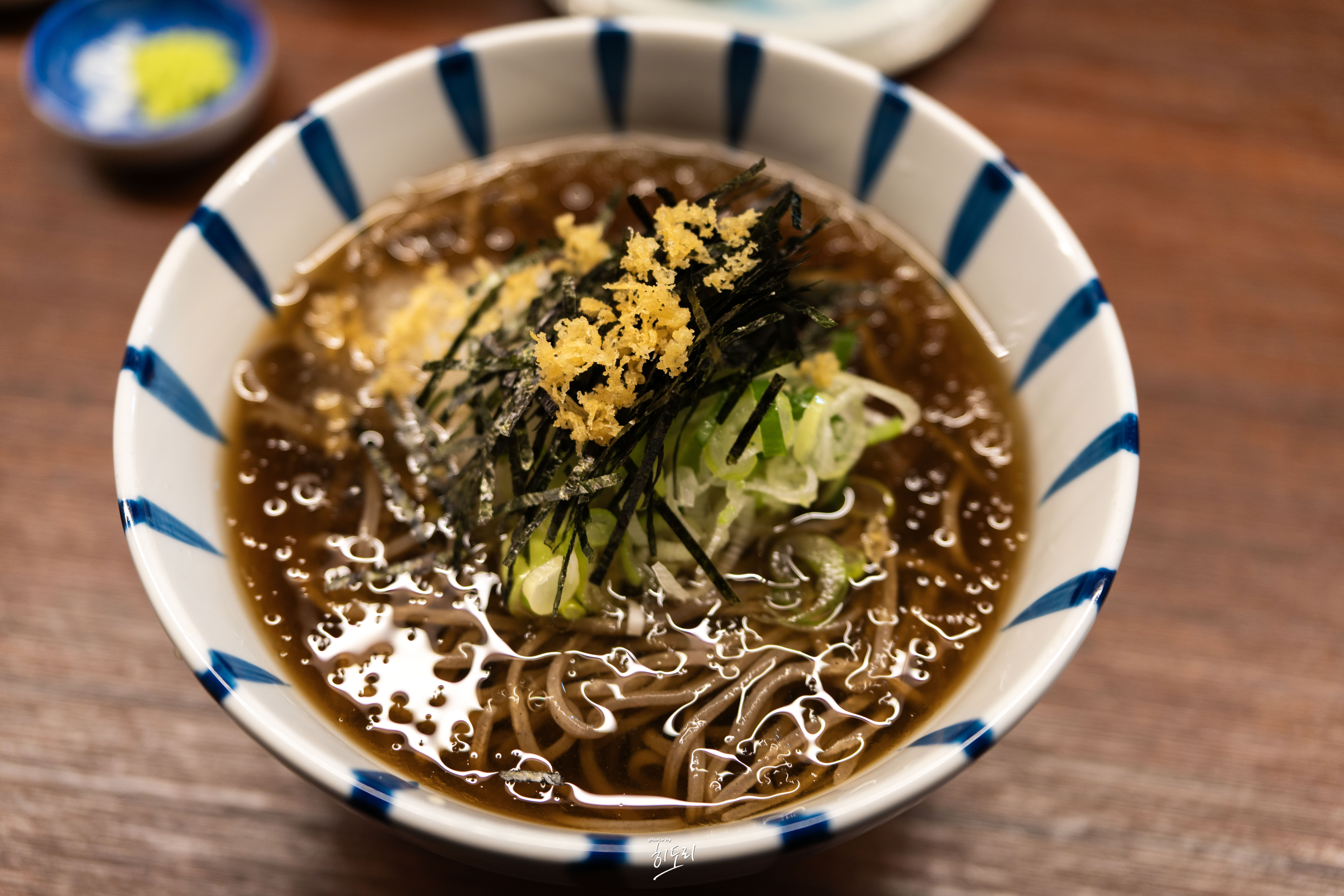 냉모밀 입니다. 간무가 듬뿍 올라가 있어 잘 섞어 한 젓가락 먹어보니 시원하고 달큰한 국물과 부드러운 면이 조화를 이루며 맛있었습니다.