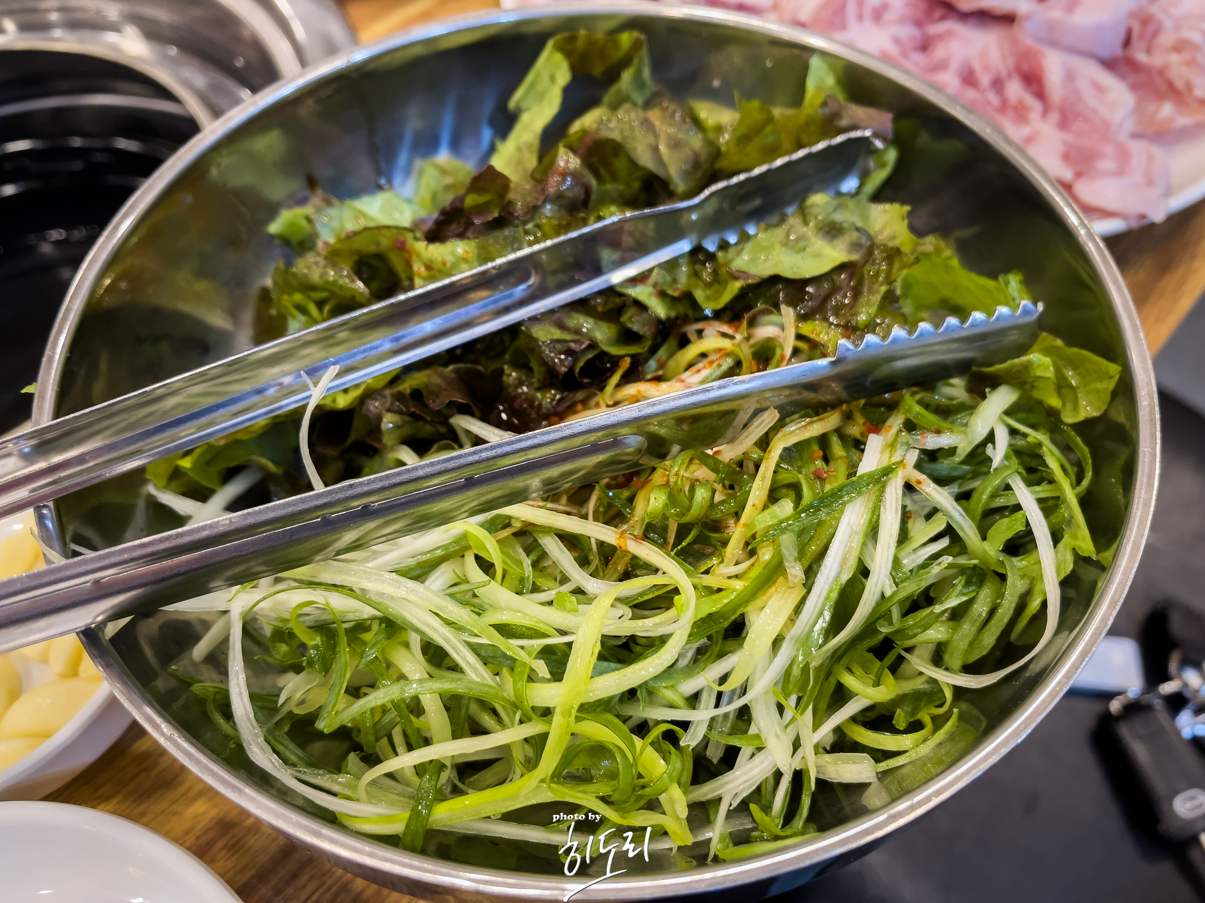 반찬 종류: 쌈채소, 파절이, 샐러드, 백김치, 다시마쌈, 어묵볶음, 양파지, 마늘, 쌈장 등