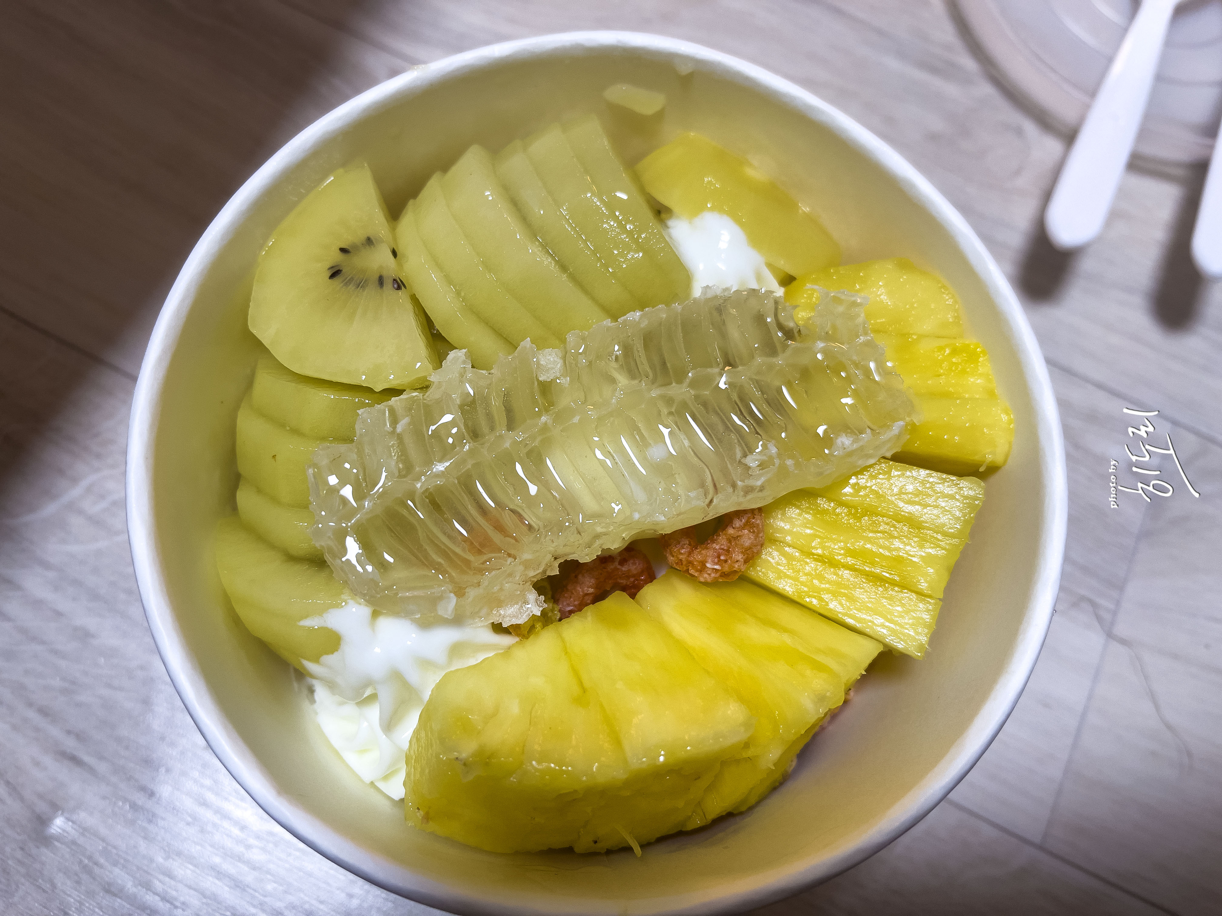주문 즉시 사장님께서 직접 제조해서 가져다 주셨어요. 첫 입을 먹는 순간, 벌꿀의 달달함, 블루베리의 상큼함, 초코링의 초코맛, 그래놀라의 고소한 맛이 입안을 가득 채웠어요. 숟가락 가득 퍼서 먹으니 정말 맛있더라고요.