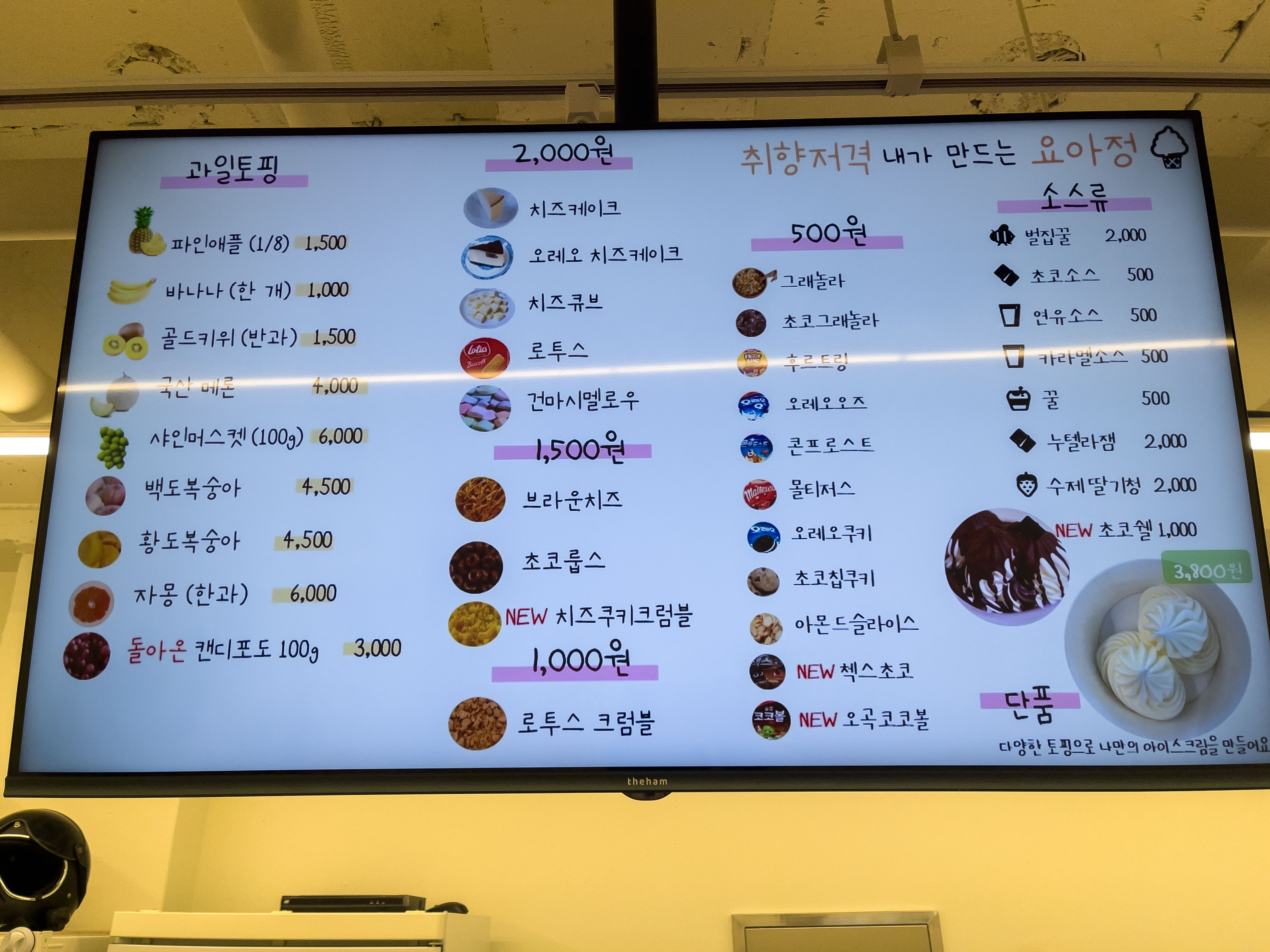 메뉴판 앞에 서니 다 맛있어 보이는데 하나만 골라야 해서 조금 당혹스러웠어요. 하지만 토핑으로 야무지게 추가해서 먹으면 되니까 괜찮더라고요. 주문한 '요아정 시그니처'에 초코링과 꿀을 추가했어요. 2인 기준으로 주문했더니 대략 1.5만원 정도 나왔습니다.