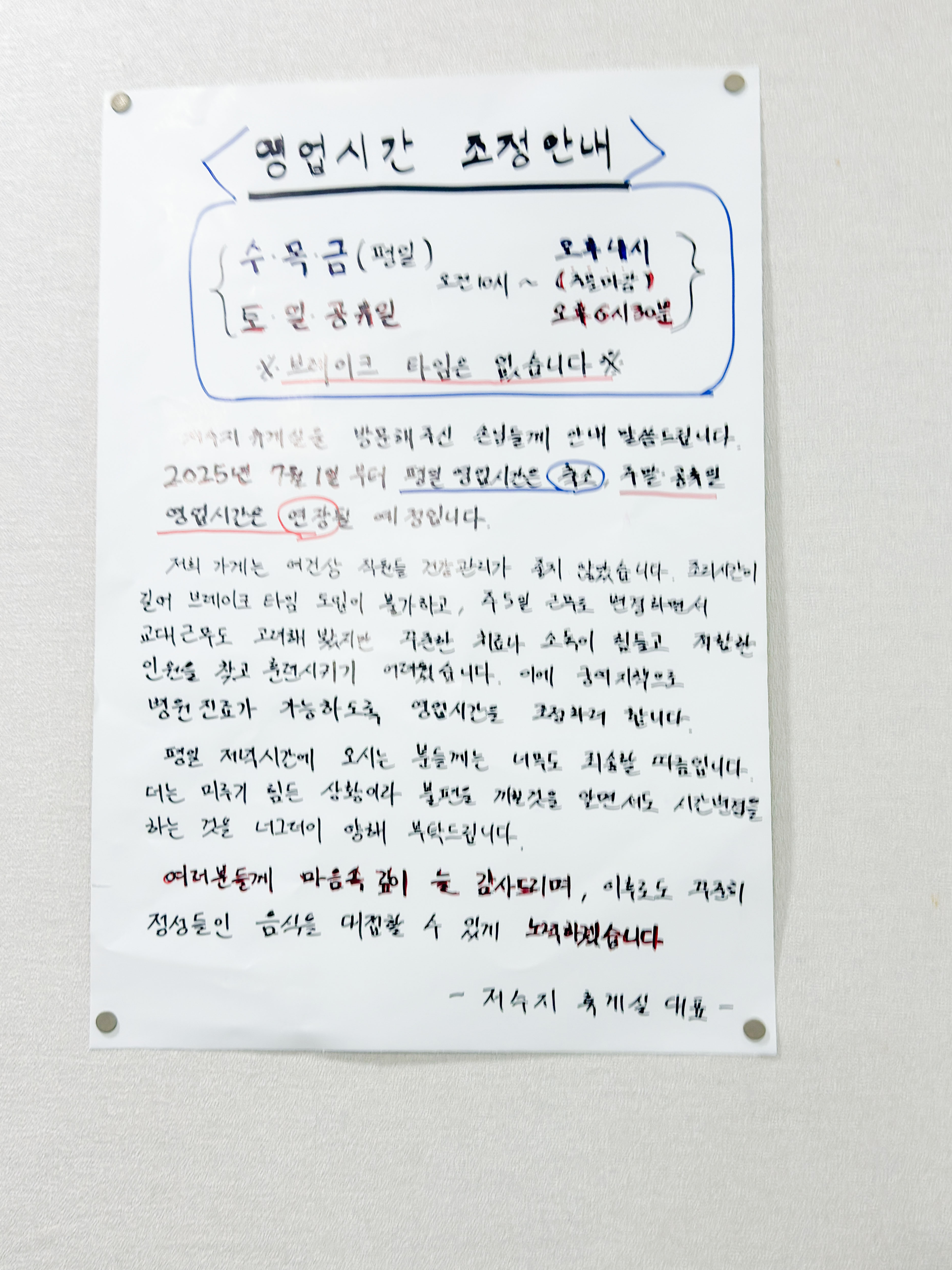 아 영업시간이 변경 되었습니다.
