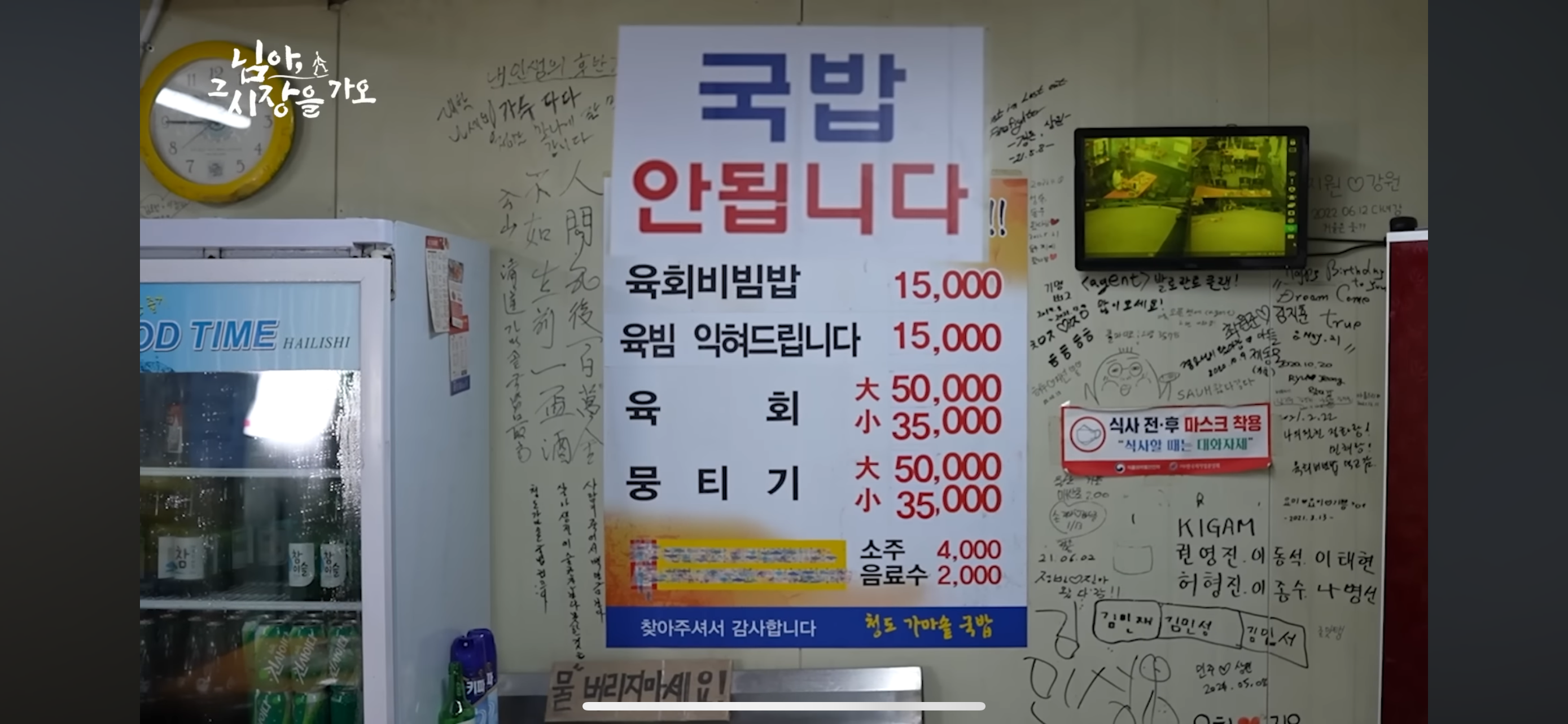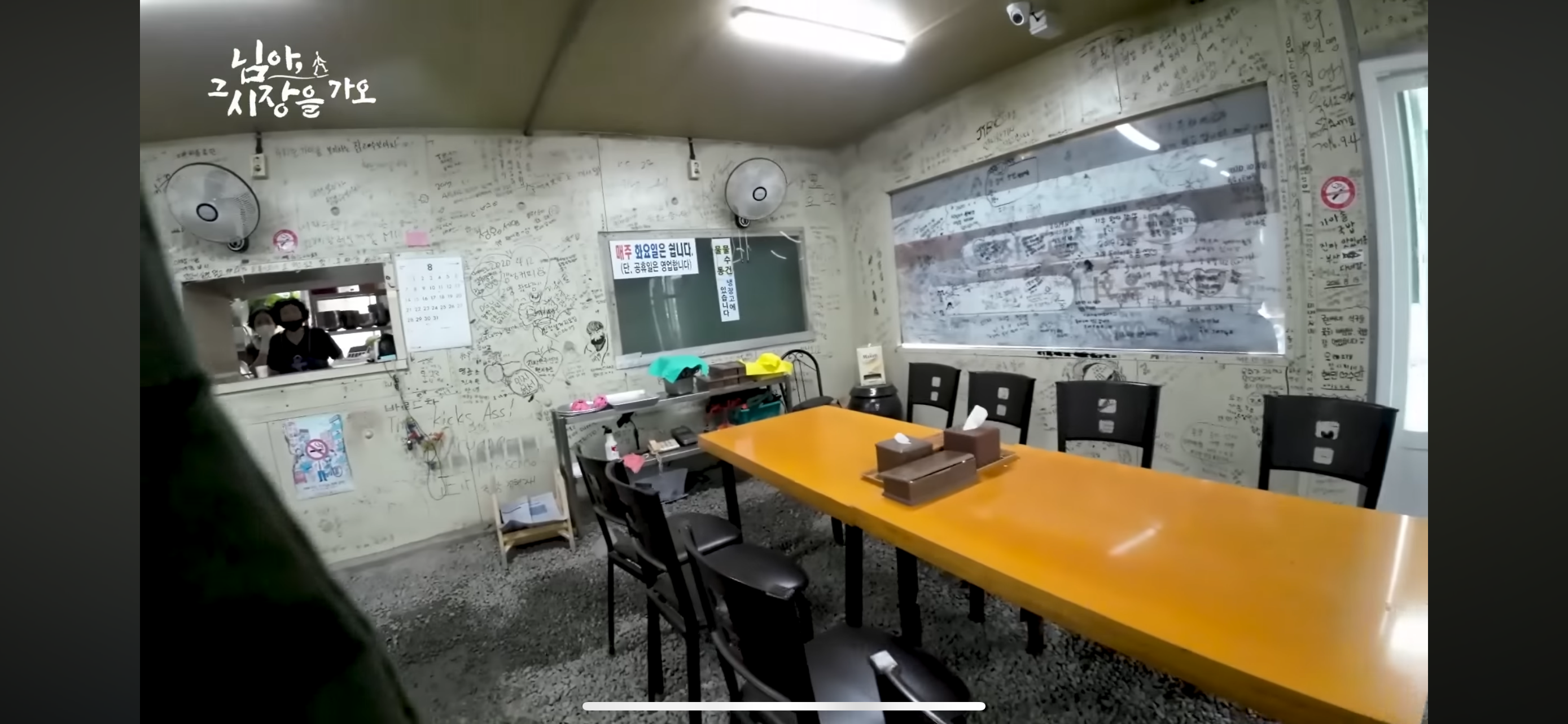 식당 내부는 손님들로 가득 차 있었고, 벽면에는 방문객들의 낙서가 가득했어요. 이곳에서는 번호표를 뽑아야 하며, 인원수에 관계없이 한 장만 뽑으면 됩니다. 11시 조금 전에 도착해도 이미 많은 손님들이 있었어요.