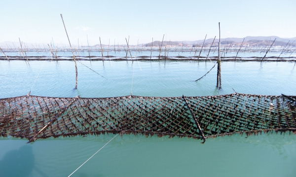 - 얕은 바다에 나무 기둥을 세우고 줄을 매달아 키움